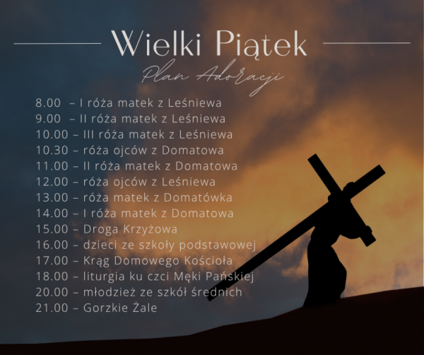 W Wielki Piątek zapraszamy do osobistej adoracji Najświętszego Sakramentu. Jest to szczególny czas trwania przy Chrystusie w godzinie Jego męki i śmierci - czas ciszy, modlitwy i wdzięczności za dar zbawienia.